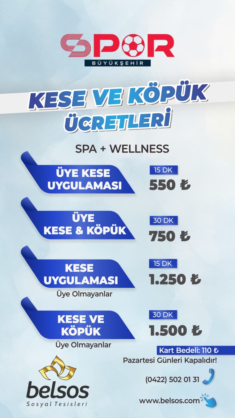 * Kese ve Köpük Uygulamaları: SPA alanımızda uzman personelimiz tarafından 15 dakikalık kese veya 30 dakikalık kese-köpük uygulamaları sunulmaktadır.