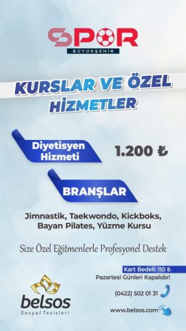 * Branş Kursları: Çocuklar ve yetişkinler için Jimnastik, Taekwondo, Kickboks, Bayan Pilates ve Yüzme Kursu gibi farklı branşlarda profesyonel eğitimler verilmektedir.